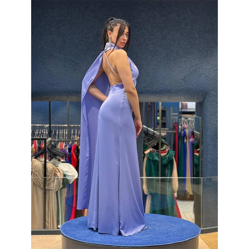 A breathtaking lavender satin evening gown featuring a sophisticated high-neck collar and a dramatic, flowing back cape. This backless, floor-length silhouette exudes effortless elegance for red carpets and high-fashion galas.